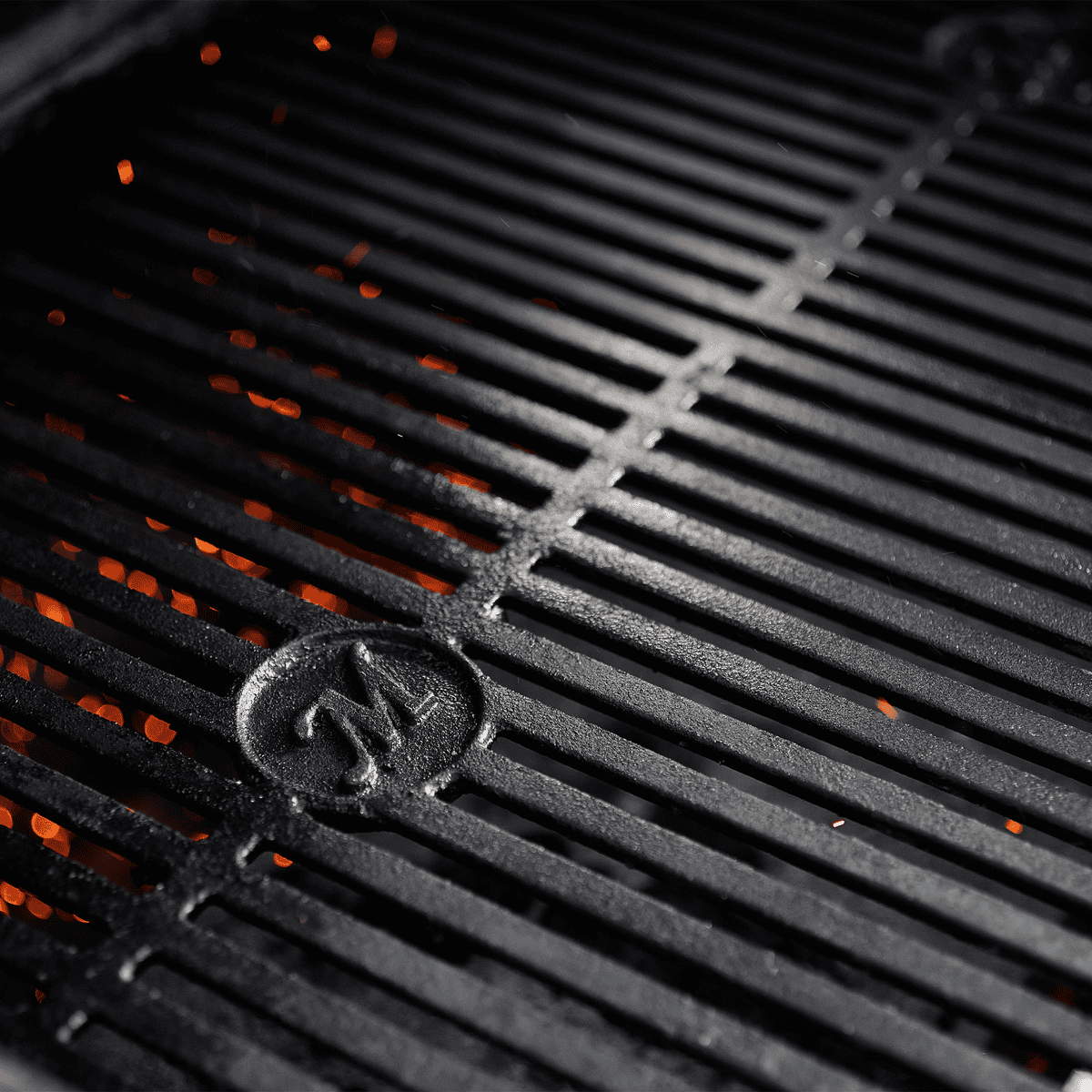 - Mit umkehrbaren gusseisernen Räucher- und Garrosten zum langsamen Räuchern oder Garen bei großer Hitze